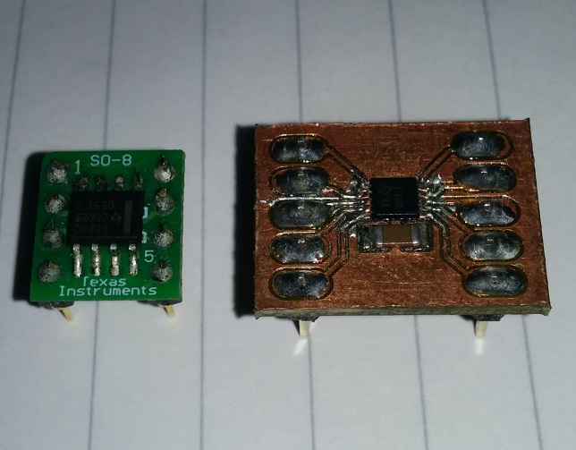 It is also possible to buy these from other vendors or even make them yourself, the next few images shows the MSP430G2230 soldered on to the Texas Instruments SOIC to DIP evaluation PCB. Also shown is a PCB I manufactured for an ADS118IDGST 16bit ADC, which is a Micro Small Outline Package (MSOP-10), this was covered in an earlier Stellaris tutorial which can be found here.
