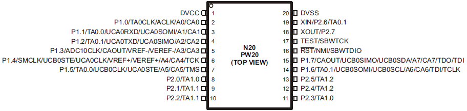 Looking at the 20 pin MSP430G2253 supplied with the Launchpad, it has two GPIO ports. Both ports have 8 GPIO pins numbered as follows, port 1 pins P1.0 to P1.7 and port 2 pins P2.0 to P2.7. The image below is extracted from the MSP430G2253 datasheet.