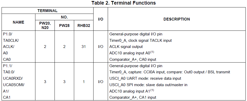All the individual GPIO pins can be configured to connect to internal peripherals, for example, providing a connection for the ADC to an external source, or providing the output from Timer module in the shape of a PWM signal. The GPIO’s as the acronym tells also provide General Purpose Input and Output operations. Not all of the GPIO pins can be configured to be used by all the internal peripherals, a detailed list of how the pins can configured can be found in the datasheet for that particular microcontroller. The image below again shows an extract from the MSP430G2253 datasheet, illustrating the GPIO pins P1.0 and P1.1 and their individual associated peripheral functions.